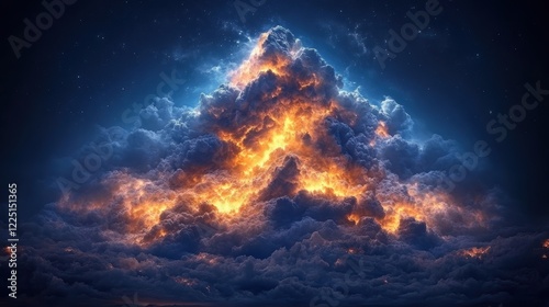 Fiery pyramid of clouds illuminated at night against a starry sky