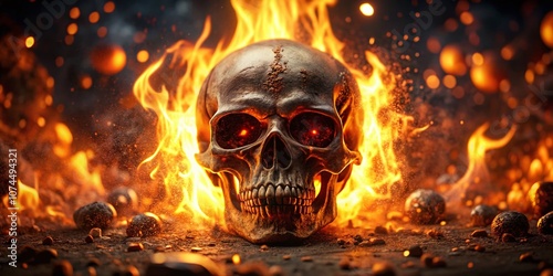 Fiery Skull Emblem with a High Depth of Field Effect, Capturing the Intensity of Flames Surrounding a Dark Skull, Perfect for Halloween and Fantasy Themes