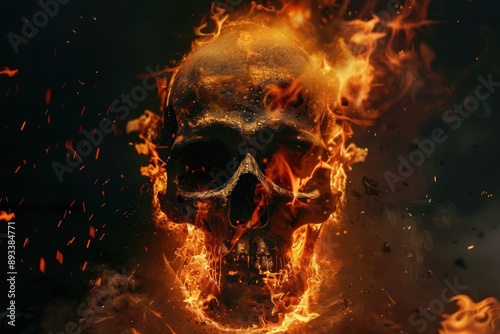 Fiery skull engulfed in flames and embers, set against dark backdrop. Represents themes of war