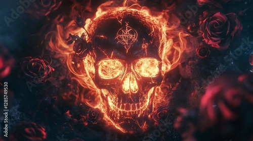 Fiery Skull Surrounded by Dark Red Roses with Mysterious Symbol Art