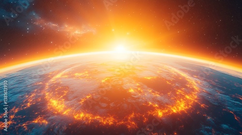 Fiery sunrise illuminates a planet's surface, showing a large area of glowing lava
