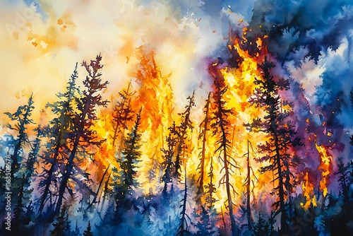 Fiery Sunset A Watercolor Depiction of a Wildfire Consuming a Coniferous Forest.