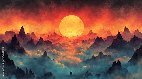 Fiery sunset illuminates dramatic mountain range shrouded in mystical fog. AI Generated