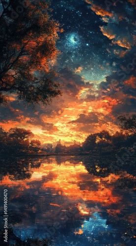 Fiery sunset reflected in a calm lake, under a crescent moon and starlit sky, framed by dark trees
