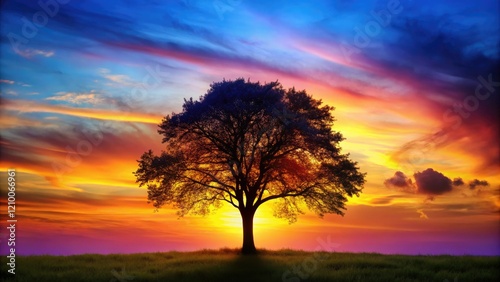 Fiery sunset silhouettes a tree, digitally painted in orange and purple gradients. Nature's breathtaking beauty captured.