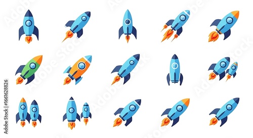 Fifteen Colorful Rocket Ships on White Background, Representing Space Exploration and Innovation