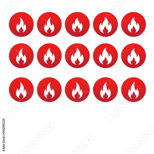 Fifteen red circular icons displaying white flame symbols arranged in a grid pattern on a white background.