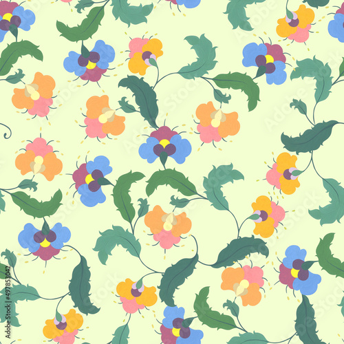 Figured flowers in folklore style. Bright flowers and leaves with scrolls. Watercolor seamless pattern on a delicate yellow-green background.