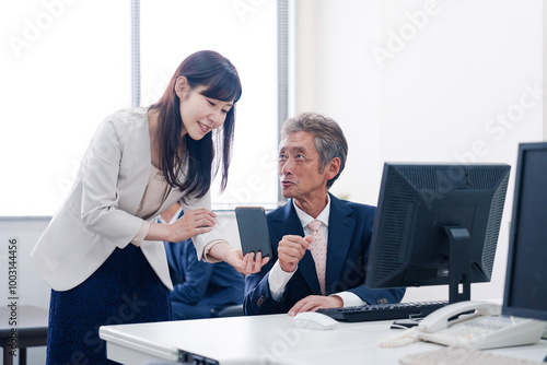 上司にスマホを見せる女性社員