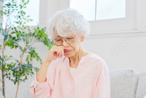 鼻づまりのシニア女性 リビングルーム