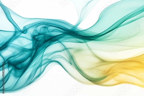 煙や水の中のインクの質感の抽象バナー。白背景にターコイズグリーンと黄色の流動体