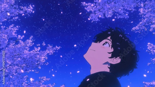 星空の下で桜を眺めるアニメキャラクター