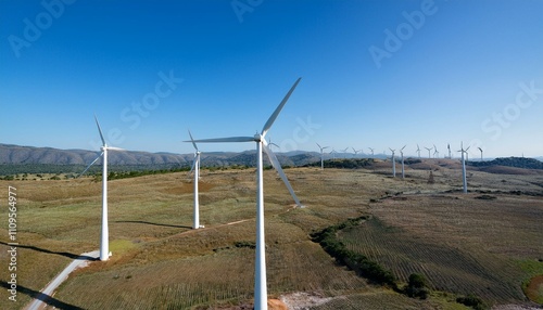 거대한 터빈 블레이드가 회전하며 풍력을 생산하는 풍력발전기 단지