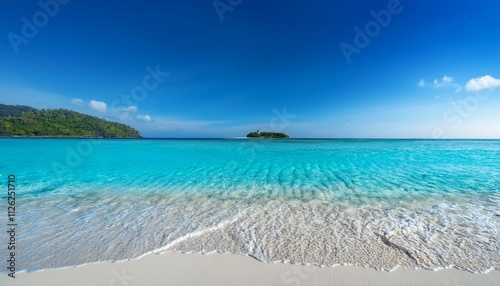 透明な海と白い砂浜が描く静かな海岸線、青空と小さな島がアクセントの風景