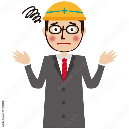 安全ヘルメットのグレーのスーツの男性 上半身 困る