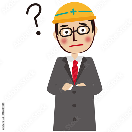 安全ヘルメットのグレーのスーツの男性 上半身 ハテナ