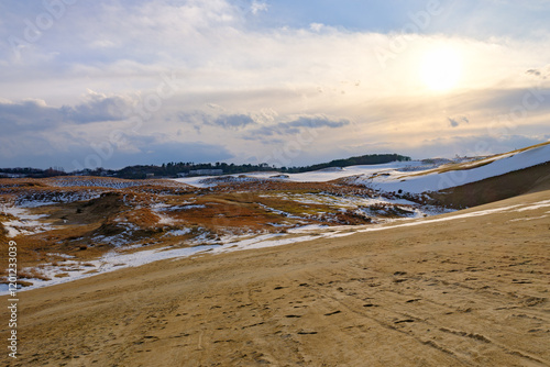 雪が積もった冬の鳥取県の鳥取砂丘 旅行