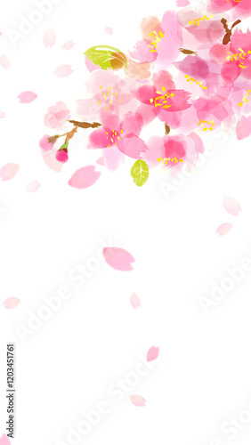 水彩の桜の一枝と舞う花びらのフレーム(縦)
