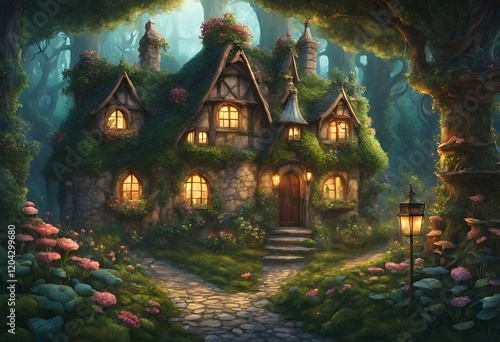 深い森の中にある植物が生い茂る家のイラスト