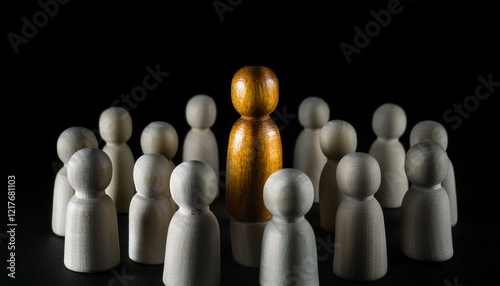 검은 배경 위에서 수많은 회색 형상들이 자리 잡고 있는 가운데, 한 인물만 황금빛을 받으며 주변과 확연히 대비된다