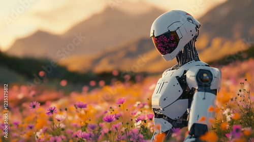 花畑に佇む未来的なロボット