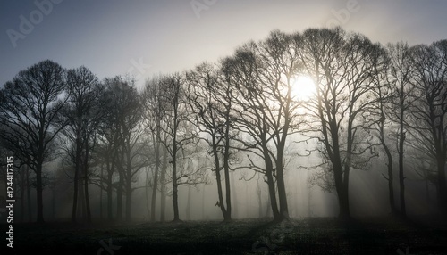 안개 자욱한 숲속에서 빛을 향해 뻗어나가는 나뭇가지들의 실루엣