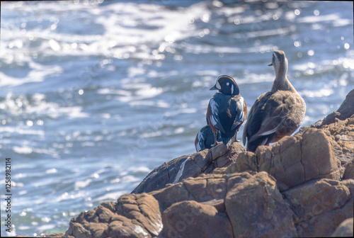 岩場で休むシノリガモ