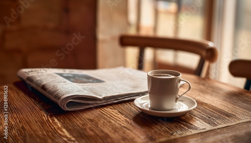 카페 테이블 위, 신문 한 장과 작은 머그잔, 여유로운 아침