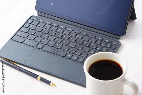 コーヒーを飲みながら、キーボードを接続したタブレット端末で、デスクワークをしているイメージ