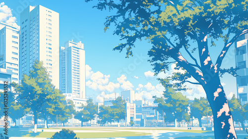 広大な公園と高層ビルが共存する美しい都市景観|澄み渡る青空と木々が織りなす爽快な風景|未来的な都市と緑の融合