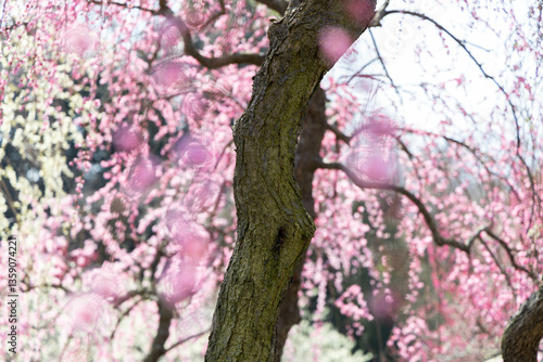 三重県いなべ市梅林公園の鮮やかな梅の木,満開の梅の花