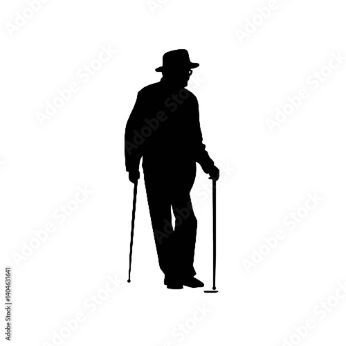 杖を持った老人のシルエット、全身黒色のみ