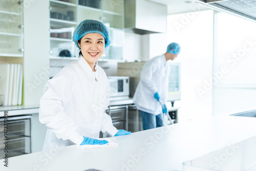 厨房を清掃する衛生白衣を着た男女スタッフ