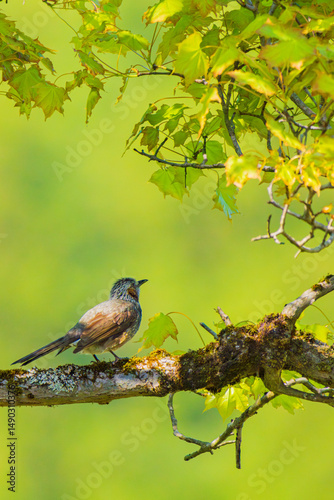 新緑の葉を見上げるヒヨドリ(縦構図)