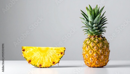 落ち着いたライトグレー背景に、鮮やかでみずみずしい黄色のパイナップル輪切りが左下隅に静かに置かれた夏のイメージ。
