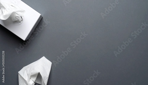 マットで深みのあるチャコールグレー背景に、シンプルなプラスチックのティッシュボックスが左上に佇み、都市の静と硬質な質感を表現。