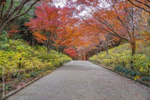 ちょうど見ごろのモミジの紅葉に囲まれた遊歩道の情景