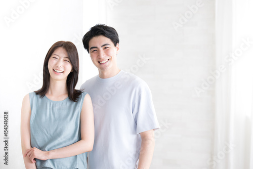 夏服のカップルのカメラ目線の笑顔白背景 右にコピースペースあり