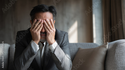 四十代の日本人の男性がソファで疲労感を抱え目を覆う
