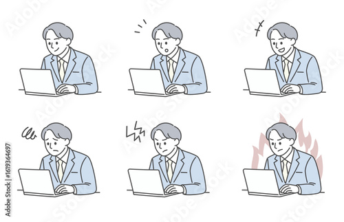 男性会社員のパソコン作業と表情変化のイラスト