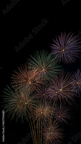 静かな夜空を鮮烈な光で染め上げる日本の夏の打ち上げ花火を描いたアート。夜景、夏祭り、観光イベント、光の演出、背景素材、華やかなデザインや告知ビジュアルにも適合。