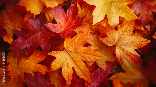 赤やオレンジの鮮やかな秋色の紅葉が全面に広がる落ち葉の背景素材
