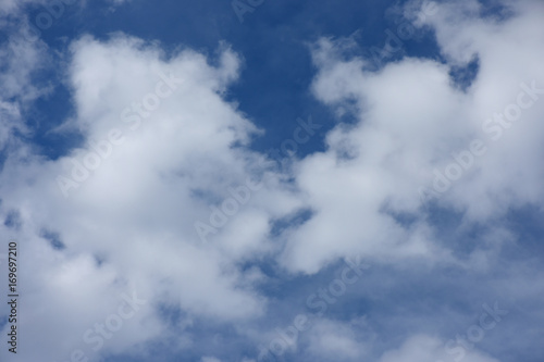 青空と雲「空想・雲のモンスターたち〔出会いがしらに鼻などにキスをするモンスターと、子供のモンスター(画面左下)がその様子を見ているイメージなど〕」愛情表現、大好きよ、おい、こんなところではずかしいよ(と少し顔を下に向けたイメージ)、仲の良い夫婦、じゃれあう、祝福などのイメージ