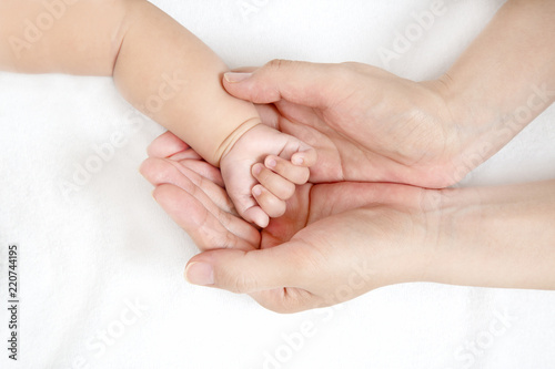 赤ちゃんの小さな手を包むお母さんの大きな両手のアップ。成長と健康を喜ぶ母。母性、愛情、幸せ、育児、健康のイメージ