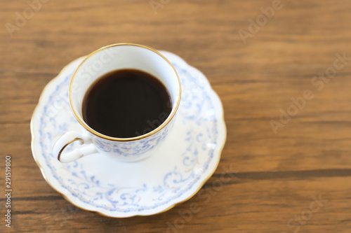 木製テーブルの上に乗った白い陶器のカップ&ソーサーにブラックコーヒー