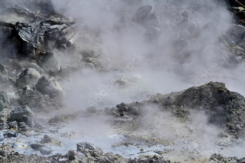 荒涼とした雲仙地獄と吹き上げる水蒸気の情景@長崎