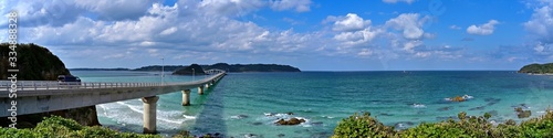 エメラルドグリーンの海と角島大橋のパノラマ情景@山口