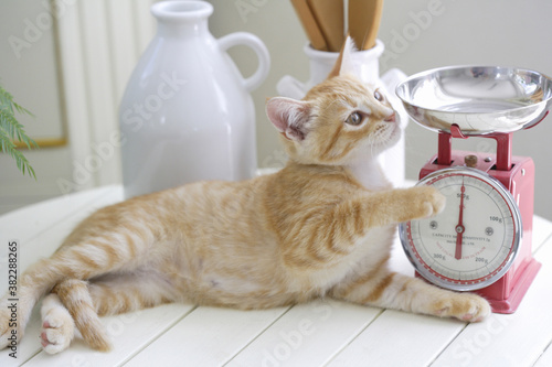 キッチンカウンターでリラックスする子猫