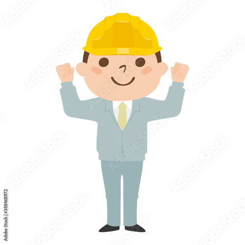 男性の建設業者のイラスト。作業着とヘルメットを着用して、元気いっぱいな若い男性。