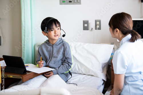 オンラインで勉強をする入院中の男の子と女性看護師さん
